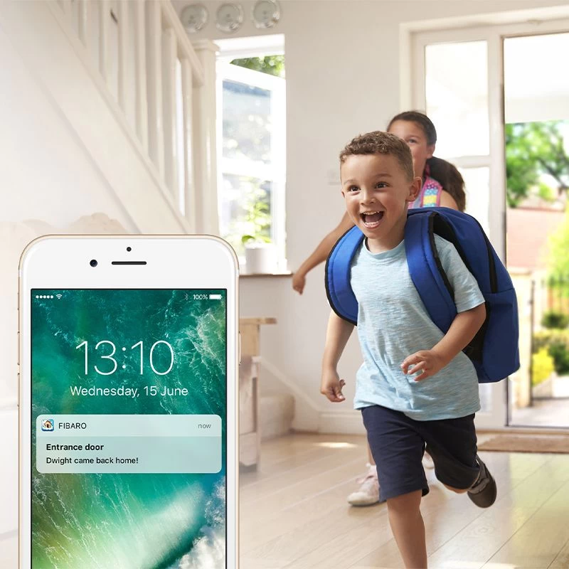 Wanneer u de FIBARO intercom integreert in uw Z-Wave systeem kan hij al uw wensen vervullen. Zo kan de intercom bij thuiskomst het alarm uitschakelen, de verlichting aandoen en u verwelkomen met uw favoriete muziek. Bent u zelf niet thuis, maar vraag u zich af of uw kinderen veilig zijn thuisgekomen? U bent meteen gerustgesteld met de FIBARO intercom, die u informeert met een melding op uw smartphone zodra ze thuiskomen. Mocht een bezoeker aan de deur staan wanneer u niet thuis bent, dan zal zijn of haar bericht worden opgenomen zodat u het later kunt afluisteren, wanneer u maar wilt. Uiteraard houdt de intercom ook een oogje in het zeil wanneer u met vakantie bent. Via uw smartphone kunt u altijd zien wie er aan de deur aanbelt, waar dan ook ter wereld, en u kunt beslissen of u hem of haar vertrouwt en binnenlaat.
