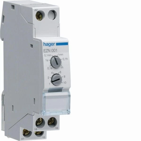 Het Hager EZ tijdrelais heeft 6 tijdbereiken met een keuze-instelling aan de voorzijde. De tijdinstelling gaat door middel van een potentiometer aan de voorzijde. De tijd kan ingesteld worden van 0,1 seconde tot 10 uur. Daarnaast is deze Hager tijdrelais ook voorzien van een schakelstand-indicatieuitgang door middel van LED.