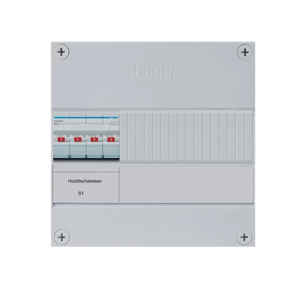Deze 4-polige witte hoofdschakelaar (RAL7035) uit de Vision serie van Hager heeft een 3-fase aansluiting, een nominale stroomsterkte van 63A en een nominale spanning van 230V. Daarnaast heeft de PS (polystyrol) behuizing een beschermingsgraad van IP30, slagvastheid van IK05 en de volgende afmetingen: 365x220x89mm (HxBxD).